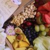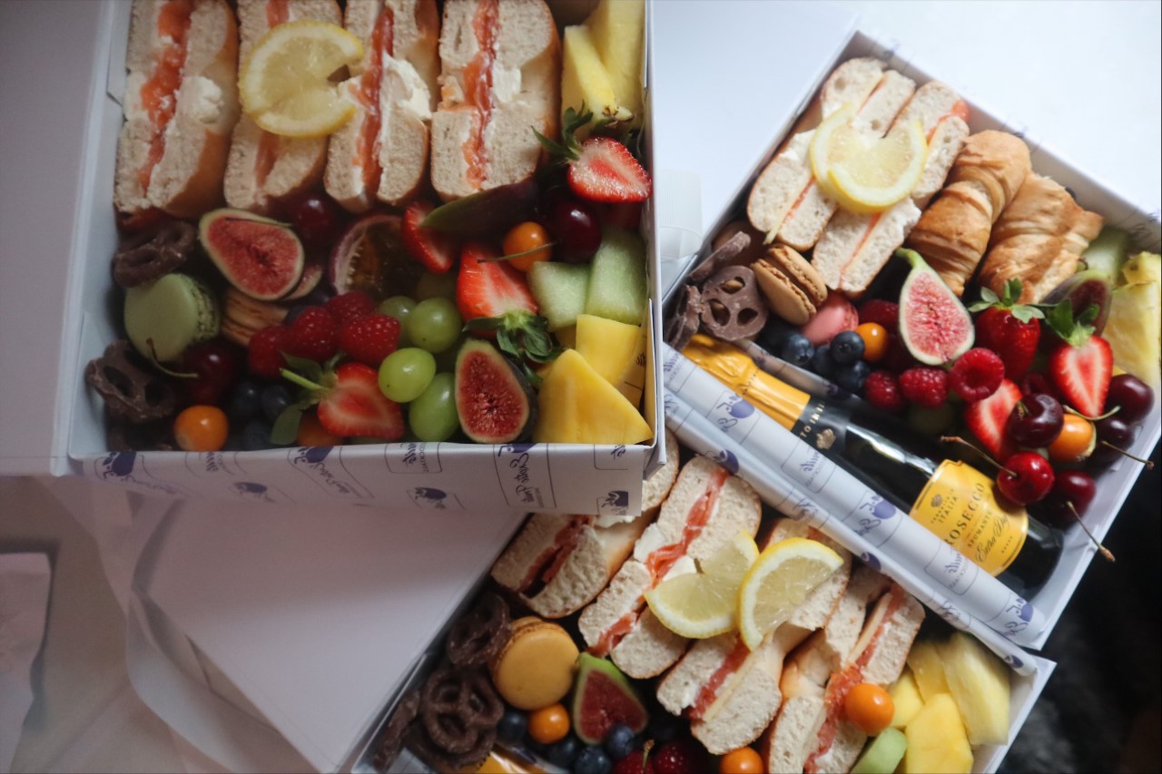 Selection of smoked salmon and cheese bagel with exotic fresh fruits and mini wine bottle.